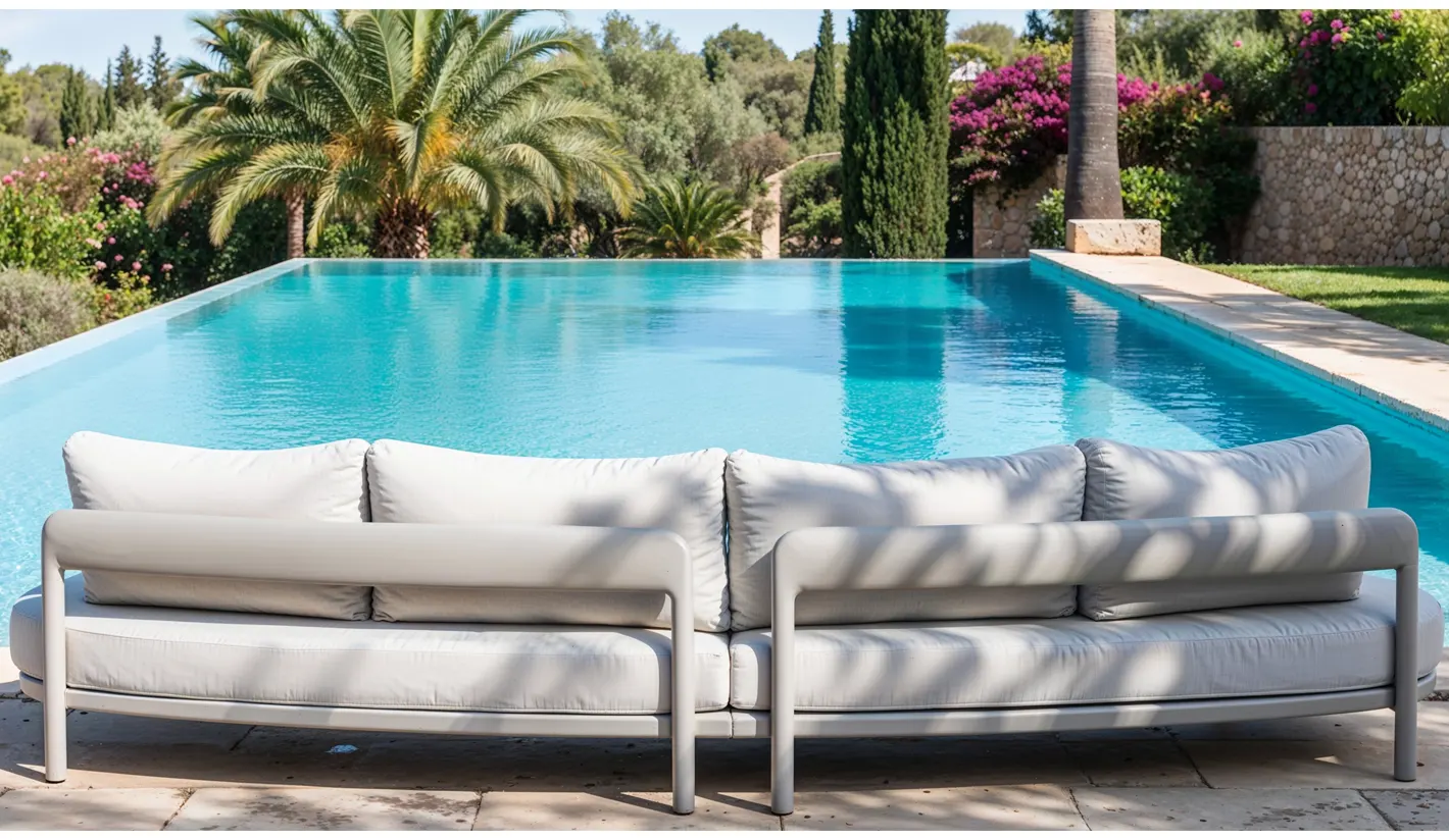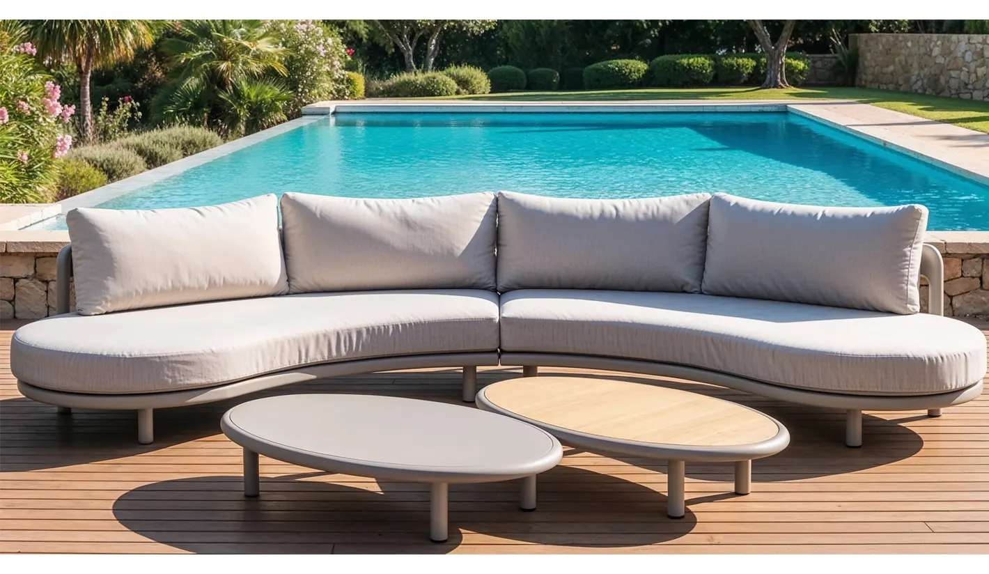 Sofá de exterior curvo de diseño contemporáneo fabricado con materiales premium, ideal para terrazas, jardines y porches modernos. Su estructura está realizada en aluminio color topo, un material ligero, resistente a la corrosión y perfecto para uso exterior durante todo el año.