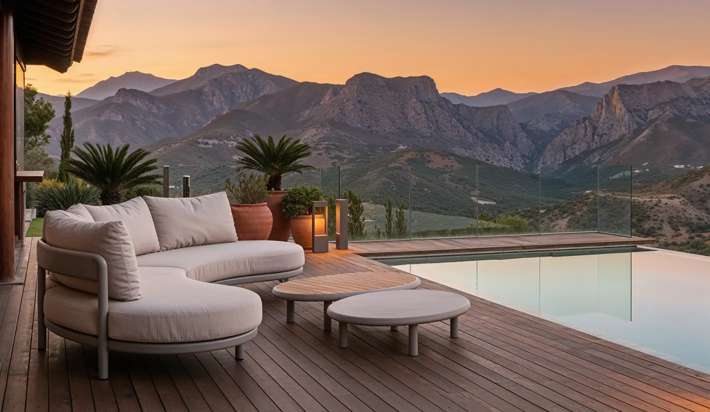La cojinería en tejido Olefina color topo ofrece un tacto suave y agradable, además de una alta resistencia al sol, la humedad y el desgaste diario. Es un tejido técnico especialmente diseñado para exteriores, fácil de mantener y con gran durabilidad frente a la decoloración.