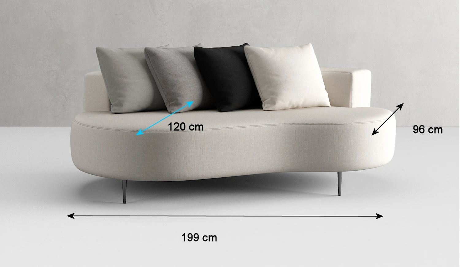 Dimensiones: 199cm x 98 cm. Altura total 68 cm. Altura asiento 40 cm. Profundidad sentada 69 cm. Se recomienda la utilización de cojines de 55x55 cm. para máximo confort