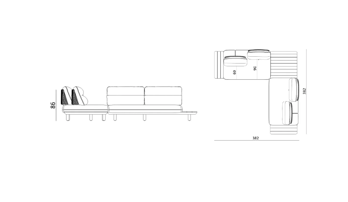 Dimensiones: Composición en L de 382 x 382 x 86h | Mesita 122 x 122 x 25h
