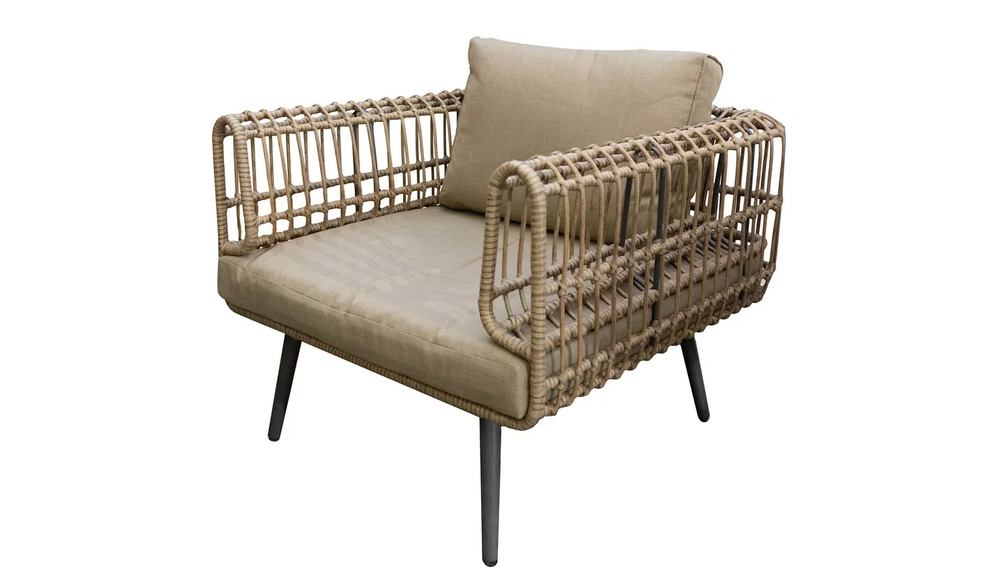 Consta de un bastidor de acero pintadp con pintura Epoxy que le permite una total protección y resistencia al exterior. Incluye un cojín desenfundable de 12 cm. 100% poliéster.