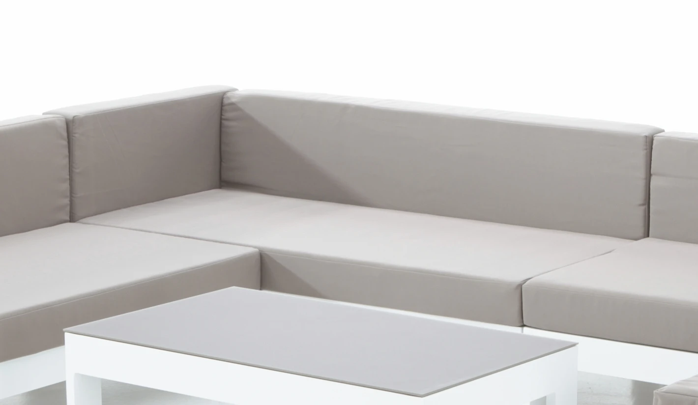 La estructura es de aluminio color blanco y los cojines son de color café.
